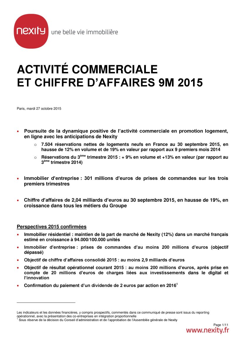 Fort de tous ces développements, et d’une croissance de son chiffre d’affaires de +19% sur les 9 premiers mois de l’année, Nexity confirme l’ensemble de ses perspectives et objectifs de l’année 2015. »