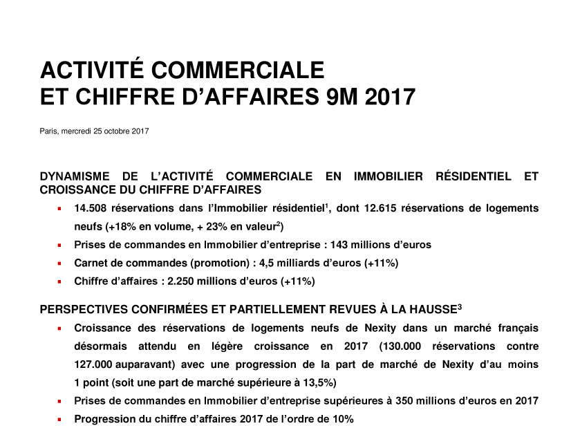 ACTIVITÉ COMMERCIALE ET CHIFFRE D’AFFAIRES 9M 2017