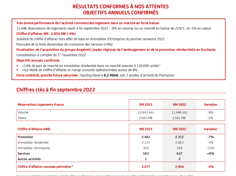 En normes IFRS, le chiffre d’affaires publié à fin septembre 2022 s’établit à 2.724 millions d’euros. Ce chiffre d’affaires exclut celui des co-entreprises en application de la norme IFRS 11, qui impose leur comptabilisation par mise en équivalence, ces dernières étant intégrées proportionnellement dans le reporting opérationnel. Le chiffre d’affaires IFRS publié aux 9M 2021 (3.022 millions d’euros) n’est pas comparable car il intégrait le chiffre d’affaires des activités cédées en 2021 (Century21 et Ægide-Domitys) pour 196 millions d’euros. A périmètre constant, la baisse est limitée à -4%.