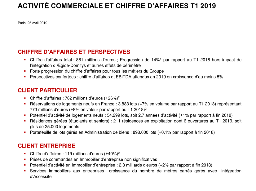 La forte progression du chiffre d’affaires au premier trimestre, qui concerne tous les métiers du Groupe, n’est pas représentative du niveau attendu à la fin de l’année mais conforte néanmoins la « guidance » donnée au marché par Nexity (croissance du chiffre d’affaires et de l’EBITDA d’au moins 5% en 2019). »