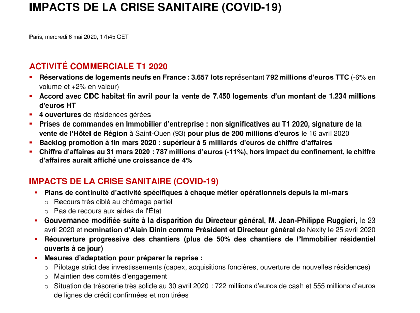 - Gouvernance modifiée suite à la disparition du Directeur général, M. Jean-Philippe Ruggieri, le 23 avril 2020 et nomination d’Alain Dinin comme Président et Directeur général de Nexity le 25 avril 2020
