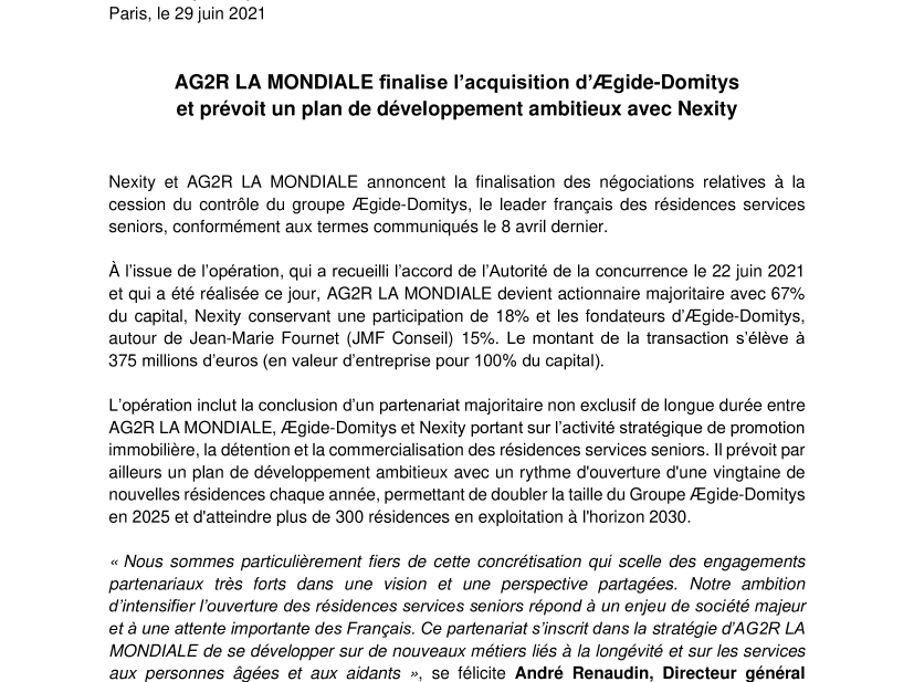 Nexity et AG2R LA MONDIALE annoncent la finalisation des négociations relatives à la cession du contrôle du groupe Ægide-Domitys, le leader français des résidences services seniors, conformément aux termes communiqués le 8 avril dernier.