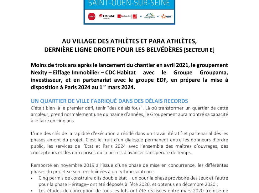 - Après l’achèvement prononcé fin décembre 2023, la mise à disposition à Paris 2024 au 1er mars 2024 s’organise ilot par ilot après une période de contre la montre supplémentaire de levées de réserves qui se terminera en février prochain.