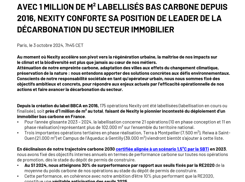 AVEC 1 MILLION DE M² LABELLISÉS BAS CARBONE DEPUIS 2016, NEXITY CONFORTE SA POSITION DE LEADER DE LA DÉCARBONATION DU SECTEUR IMMOBILIER