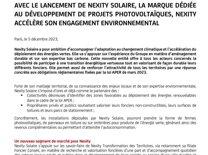 AVEC LE LANCEMENT DE NEXITY SOLAIRE, LA MARQUE DÉDIÉE AU DÉVELOPPEMENT DE PROJETS PHOTOVOLTAÏQUES, NEXITY ACCÉLÈRE SON ENGAGEMENT ENVIRONNEMENTAL