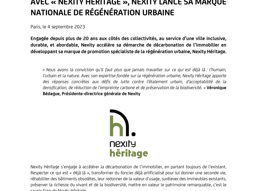 Engagée depuis plus de 20 ans aux côtés des collectivités, au service d’une ville inclusive, durable, et abordable, Nexity accélère sa démarche de décarbonation de l’immobilier en développant sa marque de promotion spécialiste de la régénération urbaine, Nexity Héritage.