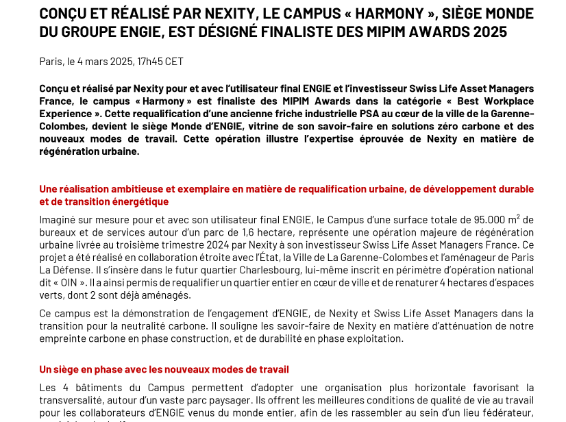 CONÇU ET RÉALISÉ PAR NEXITY, LE CAMPUS « HARMONY », SIÈGE MONDE DU GROUPE ENGIE, EST DÉSIGNÉ FINALISTE DES MIPIM AWARDS 2025