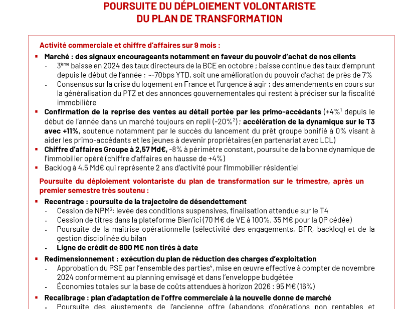 "La performance de Nexity pour ce troisième trimestre est conforme à notre trajectoire, et le scénario de la crise de notre secteur se déroule comme je le décris depuis plus d’un an. Parce que nous avions été parmi les premiers à anticiper cette crise, nous avons su les premiers nous donner les moyens de la surmonter. Des signaux positifs se confirment, avec le cycle désormais enclenché de baisse des taux et la prise de conscience générale de l’urgence à agir pour le logement, aux USA, en Europe et en France. Notre activité commerciale sur le troisième trimestre affiche une bonne dynamique sur les ventes au détail, en hausse de 11%, portée notamment par notre offre commerciale lancée fin septembre, travaillée en partenariat avec LCL. Le succès de cette offre prouve bien que la demande est forte pour les logements abordables et bas carbone. Il témoigne aussi de l’enjeu du pouvoir d’achat et des taux de crédit pour les candidats à la propriété, et de ce point de vue les récentes baisses tout comme l’annonce d’un élargissement du PTZ sont des signaux positifs pour nourrir la reprise.