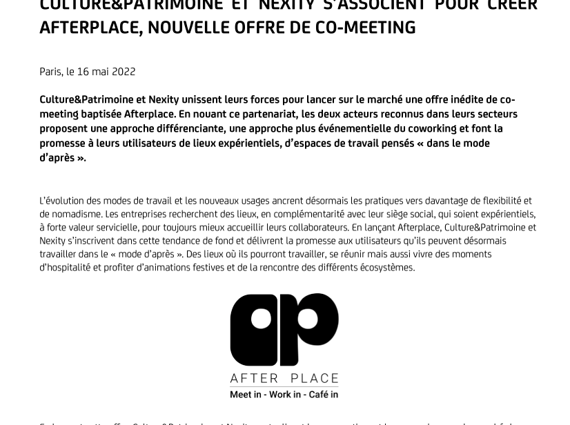 CULTURE&PATRIMOINE ET NEXITY S’ASSOCIENT POUR CRÉER AFTERPLACE, NOUVELLE OFFRE DE CO-MEETING