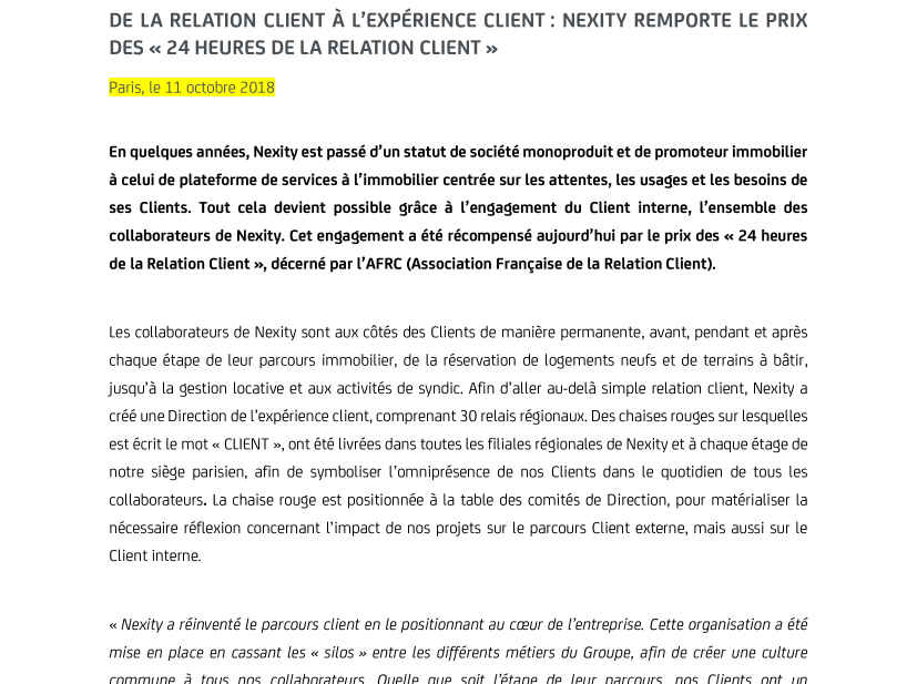En quelques années, Nexity est passé d’un statut de société monoproduit et de promoteur immobilier à celui de plateforme de services à l’immobilier centrée sur les attentes, les usages et les besoins de ses Clients. Tout cela devient possible grâce à l’engagement du Client interne, l’ensemble des collaborateurs de Nexity. Cet engagement a été récompensé aujourd’hui par le prix des "24 heures de la Relation Client", décerné par l’AFRC (Association Française de la Relation Client).