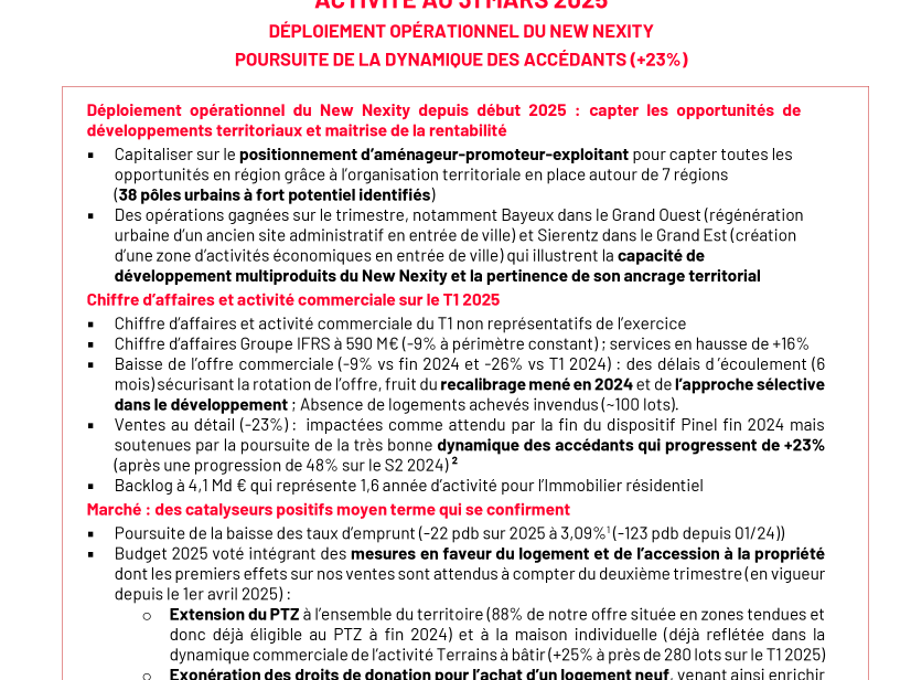 "La performance commerciale du premier trimestre est conforme à nos attentes dans un contexte marqué par une plus grande volatilité. Si les ventes au détail reflètent comme attendu la fin du dispositif Pinel, elles confirment la poursuite de la très forte dynamique des accédants qui progressent de 23% sur le trimestre, une dynamique qui devrait se poursuivre grâce à une offre commerciale recalibrée et donc parfaitement adaptée à la demande et qui bénéficiera, à compter du second trimestre, de deux mesures gouvernementales en faveur du logement, en vigueur depuis le 1er avril 2025 : dézonage du prêt à taux zéro et élargissement du dispositif aux maisons individuelles, et exonération des droits de donation pour un achat dans le neuf. Opérationnelle depuis le 9 janvier, notre nouvelle organisation monte en puissance dans l’ensemble des territoires avec déjà de beaux succès en matière de développement sur le trimestre à l’instar de Bayeux (Grand Ouest) et Sierentz (Grand Est). Axée sur le développement sélectif et la rentabilité, elle va permettre à Nexity, aménageur-promoteur-exploitant au service de la régénération urbaine et des territoires, de garder un temps d’avance et de renouer avec la croissance rentable dès 2025, tout en poursuivant la maitrise de son bilan." explique Véronique Bédague, Présidente-Directrice générale