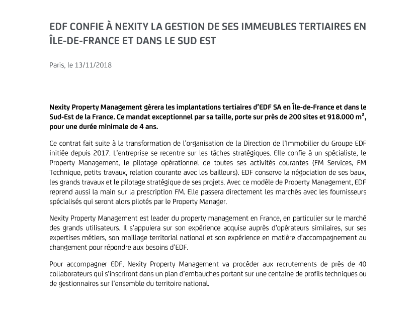 Nexity Property Management est leader du property management en France, en particulier sur le marché des grands utilisateurs. Il s’appuiera sur son expérience acquise auprès d’opérateurs similaires, sur ses expertises métiers, son maillage territorial national et son expérience en matière d’accompagnement au changement pour répondre aux besoins d’EDF.