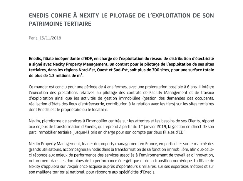 Nexity Property Management, leader du property management en France, en particulier sur le marché des grands utilisateurs, accompagnera Enedis dans la transformation de sa fonction immobilière, afin que celle-ci réponde aux enjeux de performance des services associés à l’environnement de travail et d’innovation, notamment dans les domaines de la performance énergétique et de la transition numérique. La filiale de Nexity s’appuiera sur l’expérience acquise auprès d’opérateurs similaires, sur ses expertises métiers et sur son maillage territorial national, pour répondre aux spécificités d’Enedis.