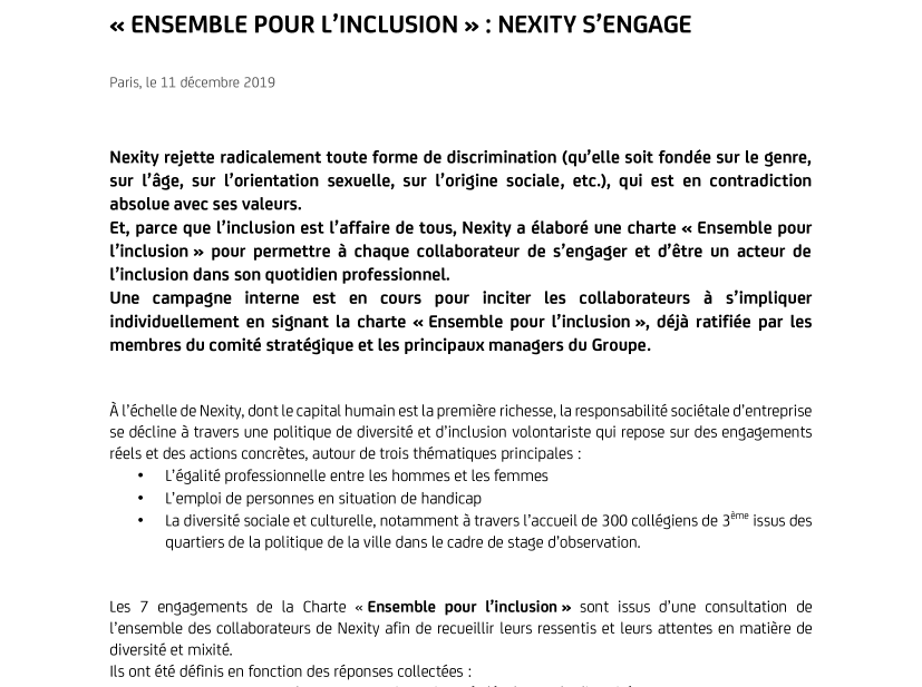 Et, parce que l’inclusion est l’affaire de tous, Nexity a élaboré une charte « Ensemble pour l’inclusion » pour permettre à chaque collaborateur de s’engager et d’être un acteur de l’inclusion dans son quotidien professionnel.