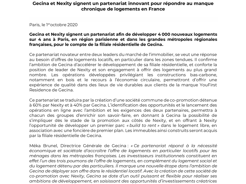 Méka Brunel, Directrice Générale de Gecina : « Ce partenariat répond à la nécessité économique et sociétale d’accroître l’offre de logements en particulier locatifs pour les ménages dans les métropoles françaises. Les investisseurs institutionnels constituent en effet l’un des trois poumons de l’offre de logements, en complément du logement social et du logement détenu par des particuliers. Il marque une nouvelle étape dans l’ambition de Gecina de déployer son offre dans le résidentiel locatif. Avec la création de cette société de co-promotion avec Nexity, Gecina se dote d’un outil puissant et flexible pour réaliser ses ambitions de développement, en saisissant des opportunités d’investissements créatrices de valeur, générant des effets d’échelle. Cet accord nous permettra d’accélérer la mise en place à grande échelle de notre marque YouFirst Residence pour nos clients. La stratégie de Gecina dans le résidentiel locatif est un facteur de résilience, dans le contexte plus général de retour des investisseurs institutionnels sur ce marché ».