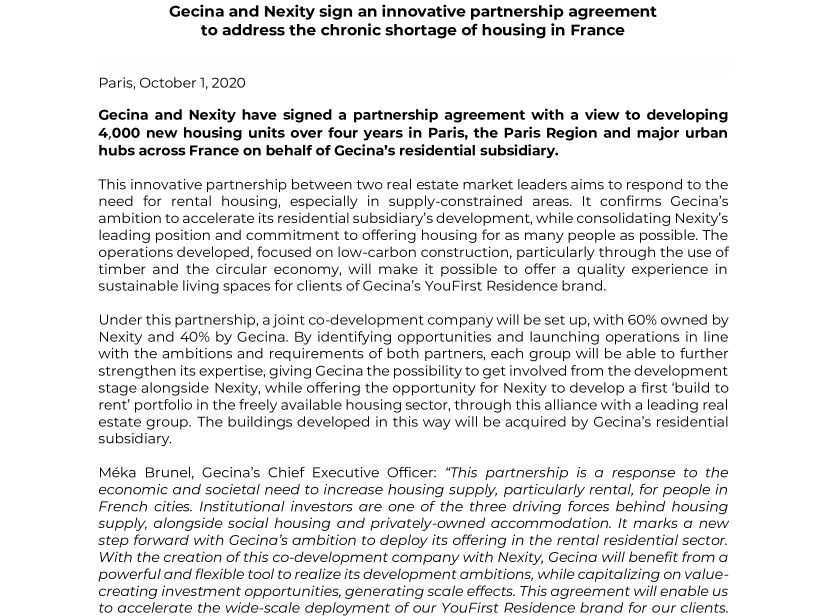 GECINA ET NEXITY SIGNENT UN PARTENARIAT INNOVANT POUR RÉPONDRE AU MANQUE CHRONIQUE DE LOGEMENTS EN FRANCE