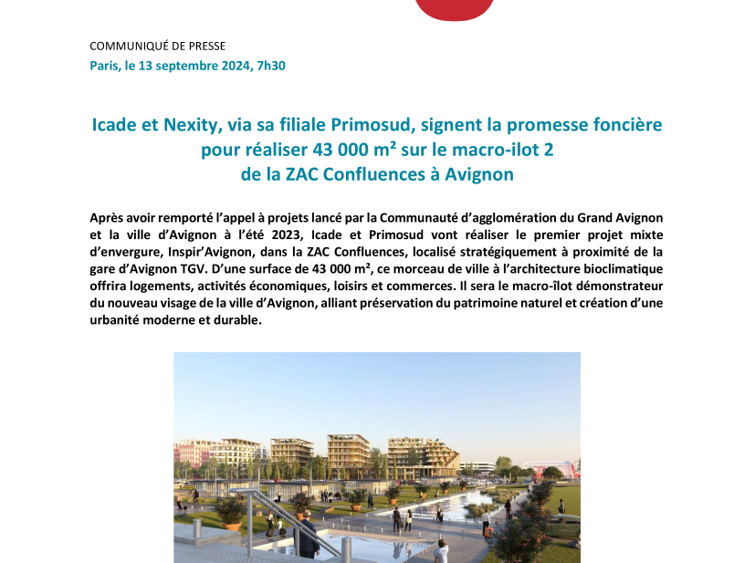ICADE ET NEXITY, VIA SA FILIALE PRIMOSUD, SIGNENT LA PROMESSE FONCIÈRE POUR RÉALISER 43.000 M² SUR LE MACRO-ÎLOT 2 DE LA ZAC CONFLUENCES À AVIGNON