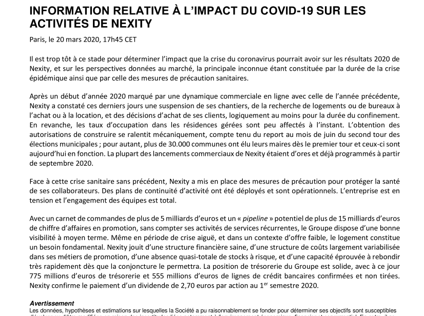 Il est trop tôt à ce stade pour déterminer l’impact que la crise du coronavirus pourrait avoir sur les résultats 2020 de Nexity, et sur les perspectives données au marché, la principale inconnue étant constituée par la durée de la crise épidémique ainsi que par celle des mesures de précaution sanitaires.