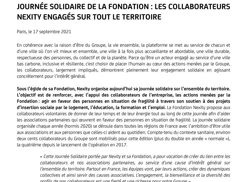 Sous l’égide de sa Fondation, Nexity organise aujourd’hui sa journée solidaire sur l’ensemble du territoire. L’objectif est de renforcer, avec l’appui des collaborateurs de l’entreprise, les actions menées par la Fondation : agir en faveur des personnes en situation de fragilité à travers son soutien à des projets d’insertion sociale par le logement, l’éducation, la formation et l’emploi. La Fondation Nexity propose aux collaborateurs volontaires de donner de leur temps et de leur énergie tout au long de cette journée afin d’aider les associations partenaires qui œuvrent en faveur des personnes en situation de fragilité. La journée solidaire organisée chaque année (hormis 2020) se déroule dans toutes les régions de France avec l’ambition d’être utile aux associations et aux personnes que celles-ci aident au quotidien. Compte-tenu du contexte sanitaire, environ deux cents collaborateurs du Groupe sont mobilisés pour cette édition (plus du double en année « normale »), la quatrième depuis le lancement de l’opération en 2017.