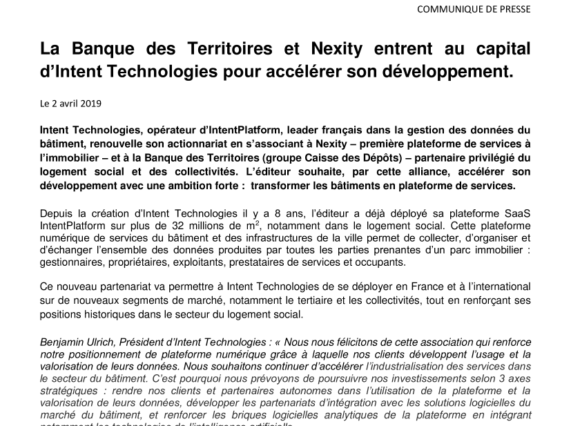 Intent Technologies, opérateur d’IntentPlatform, leader français dans la gestion des données du bâtiment, renouvelle son actionnariat en s’associant à Nexity – première plateforme de services à l’immobilier – et à la Banque des Territoires (groupe Caisse des Dépôts) – partenaire privilégié du logement social et des collectivités. L’éditeur souhaite, par cette alliance, accélérer son développement avec une ambition forte : transformer les bâtiments en plateforme de services.