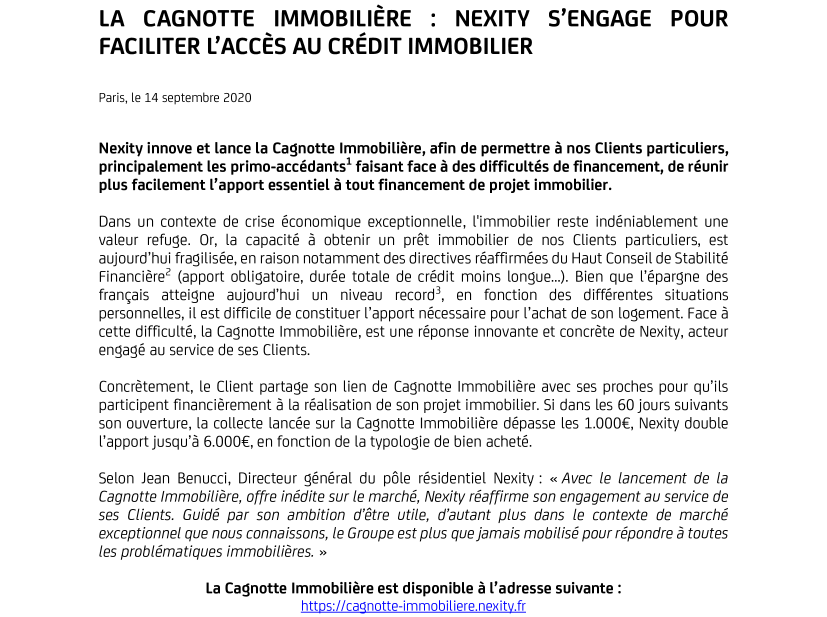 Nexity innove et lance la Cagnotte Immobilière, afin de permettre à nos Clients particuliers, principalement les primo-accédants1 faisant face à des difficultés de financement, de réunir plus facilement l’apport essentiel à tout financement de projet immobilier.