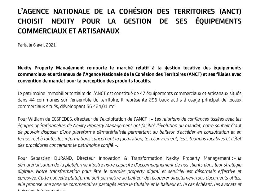 Nexity Property Management remporte le marché relatif à la gestion locative des équipements commerciaux et artisanaux de l’Agence Nationale de la Cohésion des Territoires (ANCT) et ses filiales avec convention de mandat pour la perception des produits locatifs.