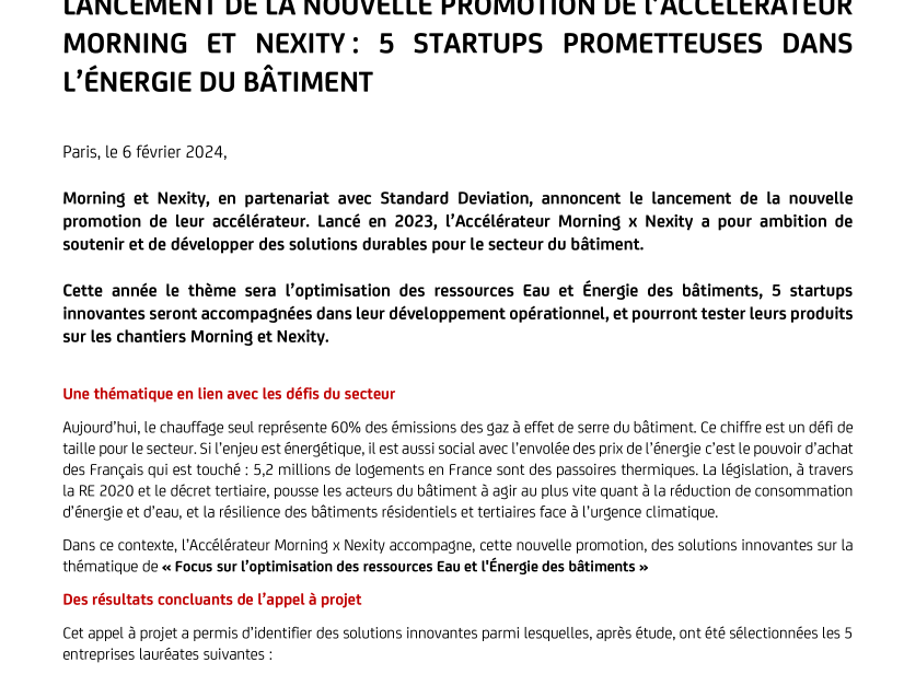 LANCEMENT DE LA NOUVELLE PROMOTION DE l’ACCÉLÉRATEUR MORNING ET NEXITY : 5 STARTUPS PROMETTEUSES DANS L’ÉNERGIE DU BÂTIMENT