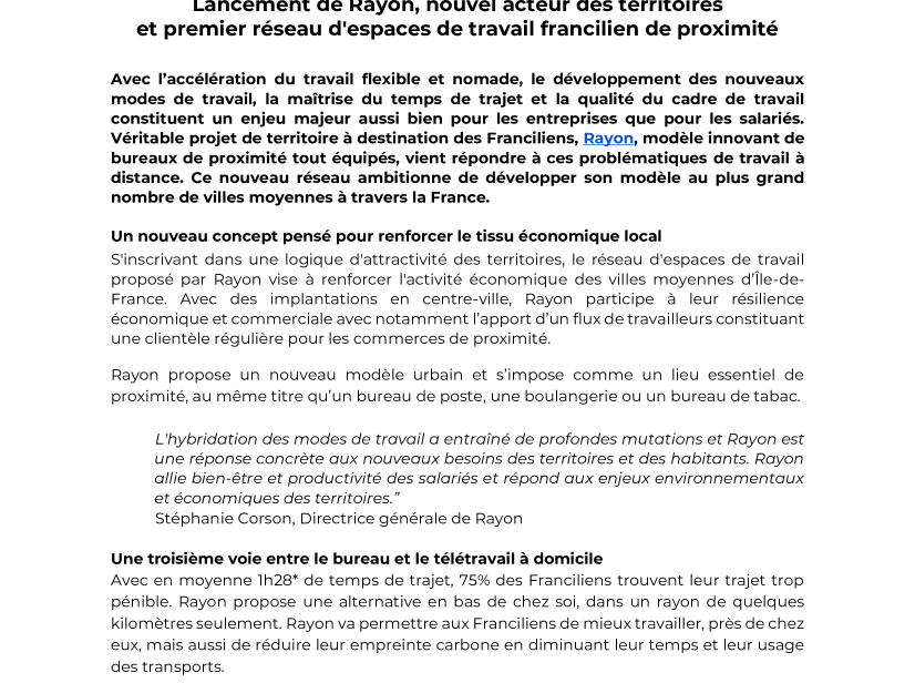 Avec l’accélération du travail flexible et nomade, le développement des nouveaux modes de travail, la maîtrise du temps de trajet et la qualité du cadre de travail constituent un enjeu majeur aussi bien pour les entreprises que pour les salariés. Véritable projet de territoire à destination des Franciliens, Rayon, modèle innovant de bureaux de proximité tout équipés, vient répondre à ces problématiques de travail à distance. Ce nouveau réseau ambitionne de développer son modèle au plus grand nombre de villes moyennes à travers la France.