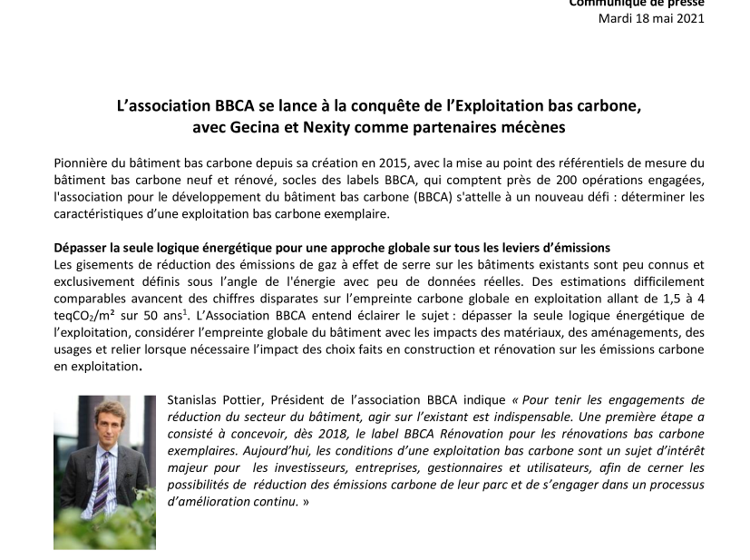 Stanislas Pottier, Président de l’association BBCA indique « Pour tenir les engagements de réduction du secteur du bâtiment, agir sur l’existant est indispensable. Une première étape a consisté à concevoir, dès 2018, le label BBCA Rénovation pour les rénovations bas carbone exemplaires. Aujourd’hui, les conditions d’une exploitation bas carbone sont un sujet d’intérêt majeur pour les investisseurs, entreprises, gestionnaires et utilisateurs, afin de cerner les possibilités de réduction des émissions carbone de leur parc et de s’engager dans un processus d’amélioration continu. »