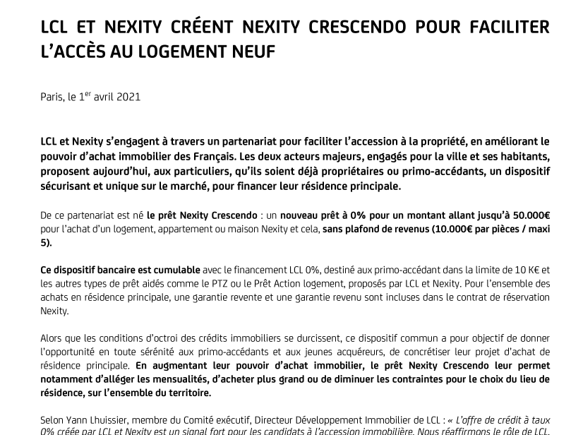 LCL ET NEXITY CRÉENT NEXITY CRESCENDO POUR FACILITER L’ACCÈS AU LOGEMENT NEUF