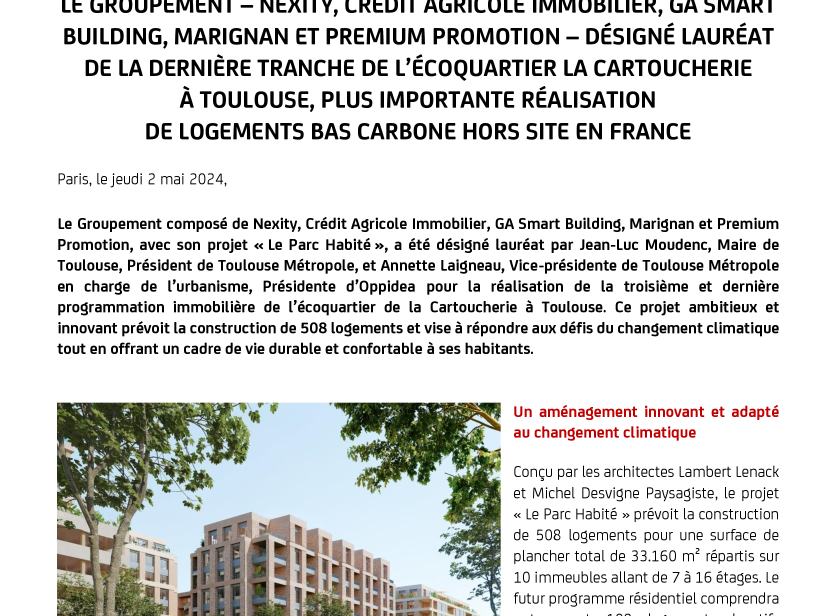 LE GROUPEMENT – NEXITY, CRÉDIT AGRICOLE IMMOBILIER, GA SMART BUILDING, MARIGNAN ET PREMIUM PROMOTION – DÉSIGNÉ LAURÉAT DE LA DERNIÈRE TRANCHE DE L’ÉCOQUARTIER LA CARTOUCHERIE À TOULOUSE, PLUS IMPORTANTE RÉALISATION DE LOGEMENTS BAS CARBONE HORS SITE EN FRANCE