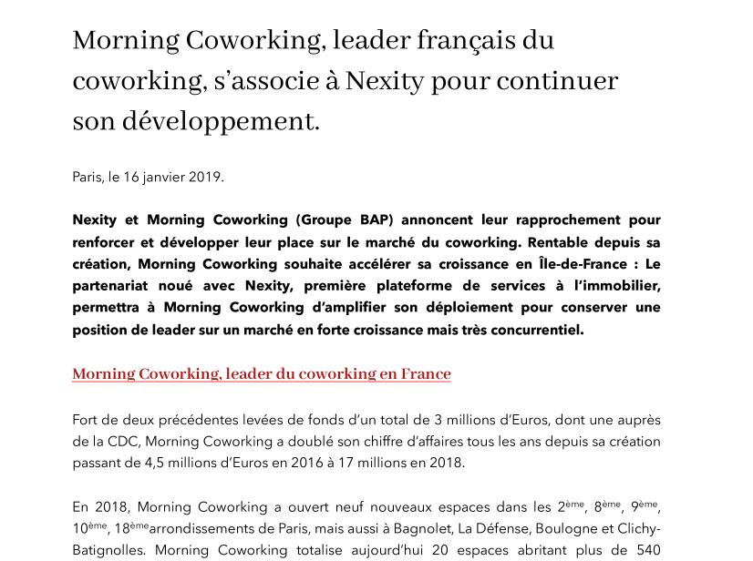 Nexity et Morning Coworking (Groupe BAP) annoncent leur rapprochement pour renforcer et développer leur place sur le marché du coworking. Rentable depuis sa création, Morning Coworking souhaite accélérer sa croissance en Île-de-France : Le partenariat noué avec Nexity, première plateforme de services à l’immobilier, permettra à Morning Coworking d’amplifier son déploiement pour conserver une position de leader sur un marché en forte croissance mais très concurrentiel.