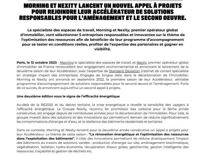 Morning le spécialiste des espaces de travail, et Nexity, premier opérateur global d’immobilier de France renouvellent leur engagement environnemental et annoncent le lancement de la deuxième saison de leur Accélérateur, avec l’expertise de Standard Deviation (cabinet de conseil spécialiste en stratégie impact des entreprises). Engagés de longue date dans la décarbonation de l’immobilier, Morning et Nexity ont annoncé en septembre 2022, la première saison de leur Accélérateur, véritable programme d'accompagnement de solutions responsables pour le second oeuvre et l’aménagement. Forts de ce succès, ils annoncent aujourd'hui un second appel à projets.