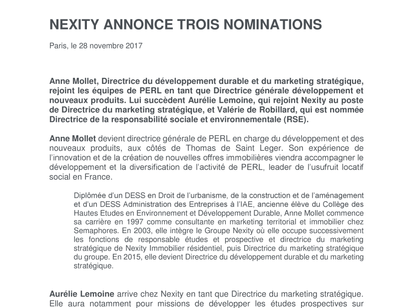 Anne Mollet, Directrice du développement durable et du marketing stratégique, rejoint les équipes de PERL en tant que Directrice générale développement et nouveaux produits. Lui succèdent Aurélie Lemoine, qui rejoint Nexity au poste de Directrice du marketing stratégique, et Valérie de Robillard, qui est nommée Directrice de la responsabilité sociale et environnementale (RSE).