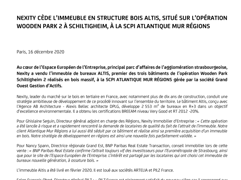 Au cœur de l’Espace Européen de l’Entreprise, principal parc d’affaires de l’agglomération strasbourgeoise, Nexity a vendu l’immeuble de bureaux ALTIS, premier des trois bâtiments de l’opération Wooden Park Schiltigheim 2 réalisés en bois massif, à la SCPI ATLANTIQUE MUR RÉGIONS gérée par la société Grand Ouest Gestion d’Actifs.