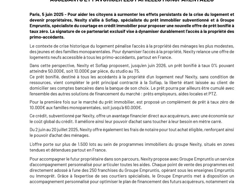 NEXITY CONCLUT UN PARTENARIAT EXCLUSIF AVEC SOFIAP ET GROUPE EMPRUNTIS POUR FACILITER L’ACCÈS À LA PROPRIÉTÉ DES PRIMO-ACCÉDANTS ET FAVORISER LES FAMILLES MONOPARENTALES