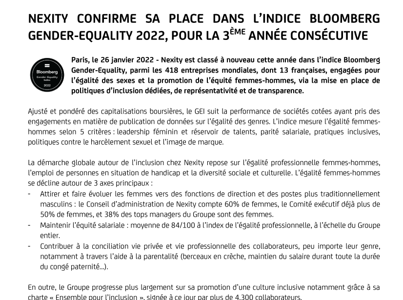 Paris, le 26 janvier 2022 - Nexity est classé à nouveau cette année dans l’indice Bloomberg Gender-Equality, parmi les 418 entreprises mondiales, dont 13 françaises, engagées pour l’égalité des sexes et la promotion de l’équité femmes-hommes, via la mise en place de politiques d’inclusion dédiées, de représentativité et de transparence.