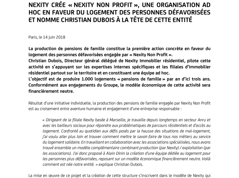 NEXITY CRÉE « NEXITY NON PROFIT », UNE ORGANISATION AD HOC EN FAVEUR DU LOGEMENT DES PERSONNES DÉFAVORISÉES ET NOMME CHRISTIAN DUBOIS À LA TÊTE DE CETTE ENTITÉ