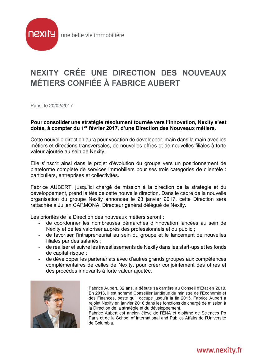 Fabrice AUBERT, jusqu’ici chargé de mission à la direction de la stratégie et du développement, prend la tête de cette nouvelle direction. Dans le cadre de la nouvelle organisation du groupe Nexity annoncée le 23 janvier 2017, cette Direction sera rattachée à Julien CARMONA, Directeur général délégué de Nexity.