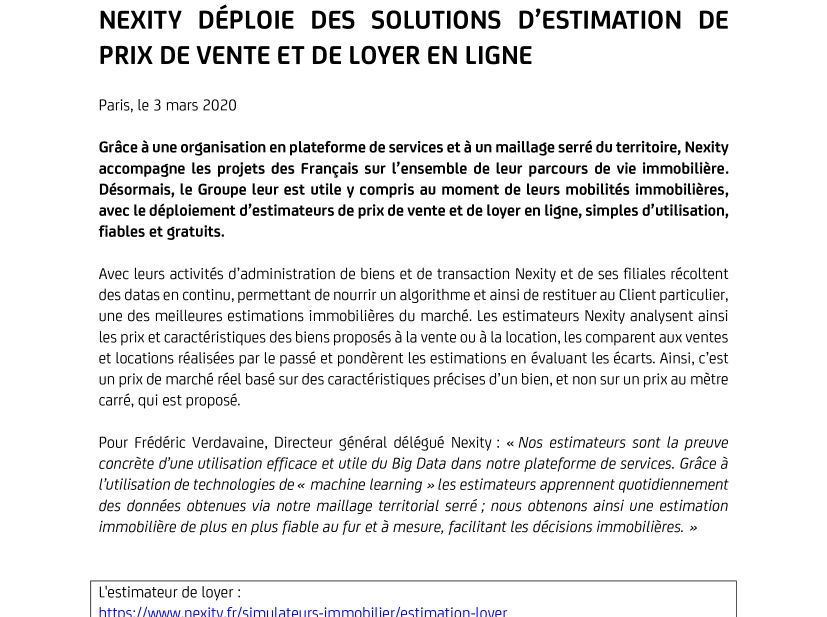 NEXITY DÉPLOIE DES SOLUTIONS D’ESTIMATION DE PRIX DE VENTE ET DE LOYER EN LIGNE