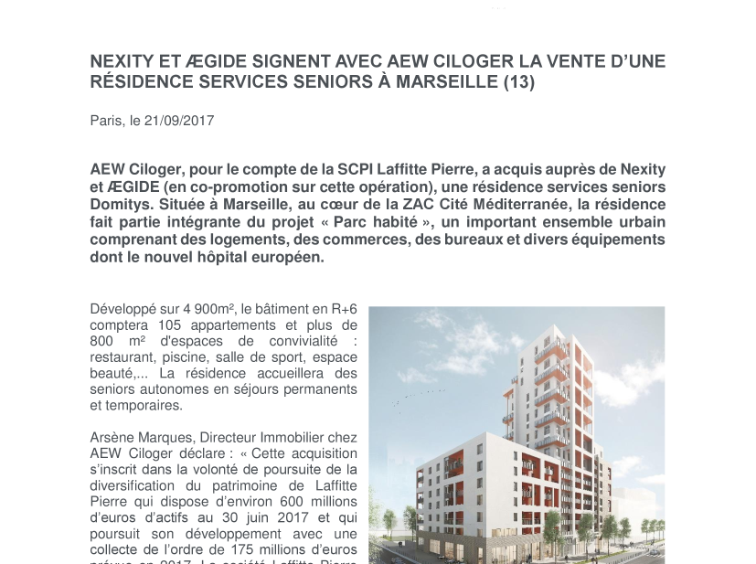 AEW Ciloger, pour le compte de la SCPI Laffitte Pierre, a acquis auprès de Nexity et ÆGIDE (en co-promotion sur cette opération), une résidence services seniors Domitys. Située à Marseille, au cœur de la ZAC Cité Méditerranée, la résidence fait partie intégrante du projet « Parc habité », un important ensemble urbain comprenant des logements, des commerces, des bureaux et divers équipements dont le nouvel hôpital européen.
