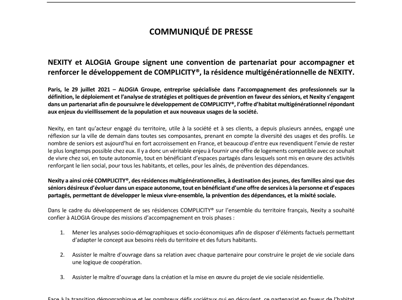 NEXITY ET ALOGIA GROUPE SIGNENT UNE CONVENTION DE PARTENARIAT POUR ACCOMPAGNER ET RENFORCER LE DÉVELOPPEMENT DE COMPLICITY®, LA RÉSIDENCE MULTIGÉNÉRATIONNELLE DE NEXITY