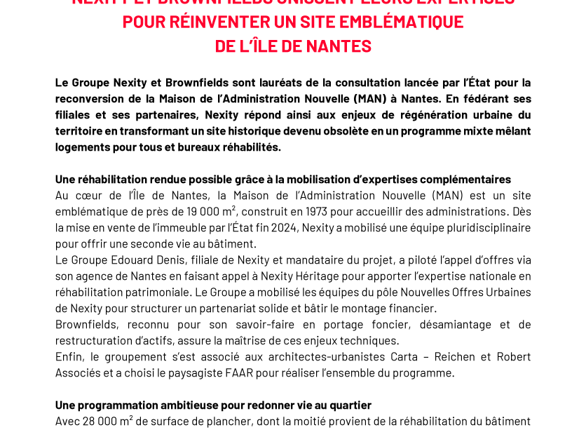 Le Groupe Nexity et Brownfields sont lauréats de la consultation lancée par l’État pour la reconversion de la Maison de l’Administration Nouvelle (MAN) à Nantes. En fédérant ses filiales et ses partenaires, Nexity répond ainsi aux enjeux de régénération urbaine du territoire en transformant un site historique devenu obsolète en un programme mixte mêlant logements pour tous et bureaux réhabilités.