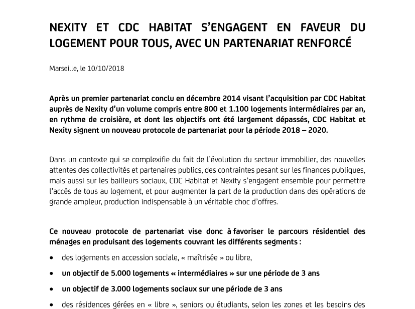 Dans un contexte qui se complexifie du fait de l’évolution du secteur immobilier, des nouvelles attentes des collectivités et partenaires publics, des contraintes pesant sur les finances publiques, mais aussi sur les bailleurs sociaux, CDC Habitat et Nexity s’engagent ensemble pour permettre l’accès de tous au logement, et pour augmenter la part de la production dans des opérations de grande ampleur, production indispensable à un véritable choc d’offres.