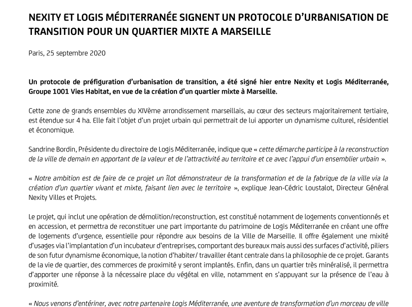 Un protocole de préfiguration d’urbanisation de transition, a été signé hier entre Nexity et Logis Méditerranée, Groupe 1001 Vies Habitat, en vue de la création d’un quartier mixte à Marseille.