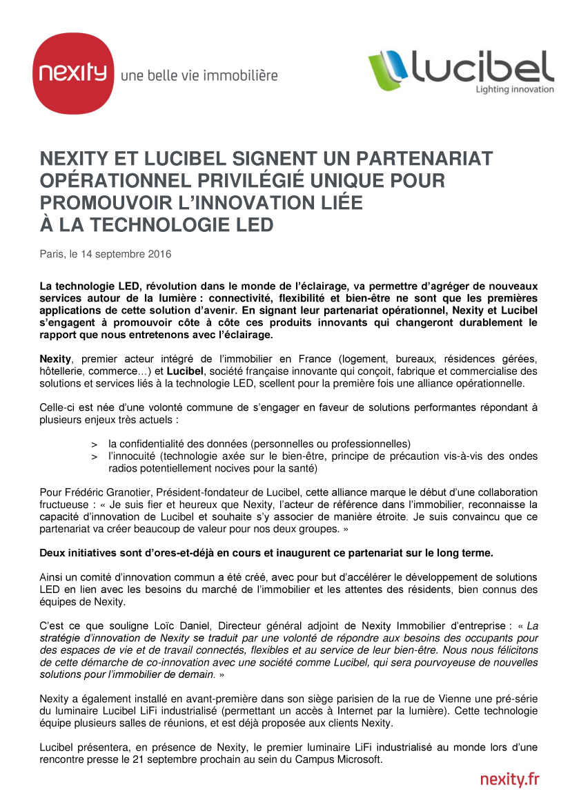 Nexity, premier acteur intégré de l’immobilier en France (logement, bureaux, résidences gérées, hôtellerie, commerce…) et Lucibel, société française innovante qui conçoit, fabrique et commercialise des solutions et services liés à la technologie LED, scellent pour la première fois une alliance opérationnelle.