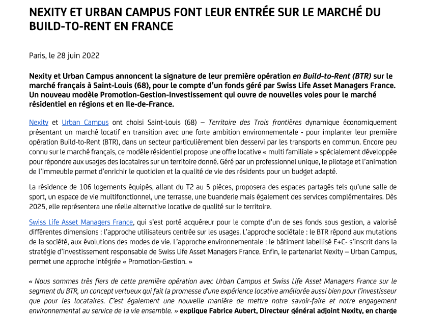NEXITY ET URBAN CAMPUS FONT LEUR ENTRÉE SUR LE MARCHÉ DU BUILD-TO-RENT EN FRANCE