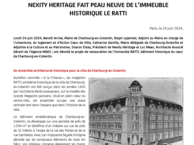 Lundi 24 juin 2024, Benoît Arrivé, Maire de Cherbourg-en-Cotentin, Ralph Lejamtel, Adjoint au Maire en charge de l’urbanisme, du logement et d’Action Cœur de Ville, Catherine Gentile, Maire déléguée de Cherbourg-Octeville et Adjointe à la Culture et au Patrimoine, Sharon Elbaz, Président de Nexity Héritage et Luc Maes, Architecte Associé Gérant de l’Agence MAES ; ont dévoilé le projet de restauration de l’immeuble RATTI, bâtiment historique du cœur de Cherbourg-en-Cotentin.