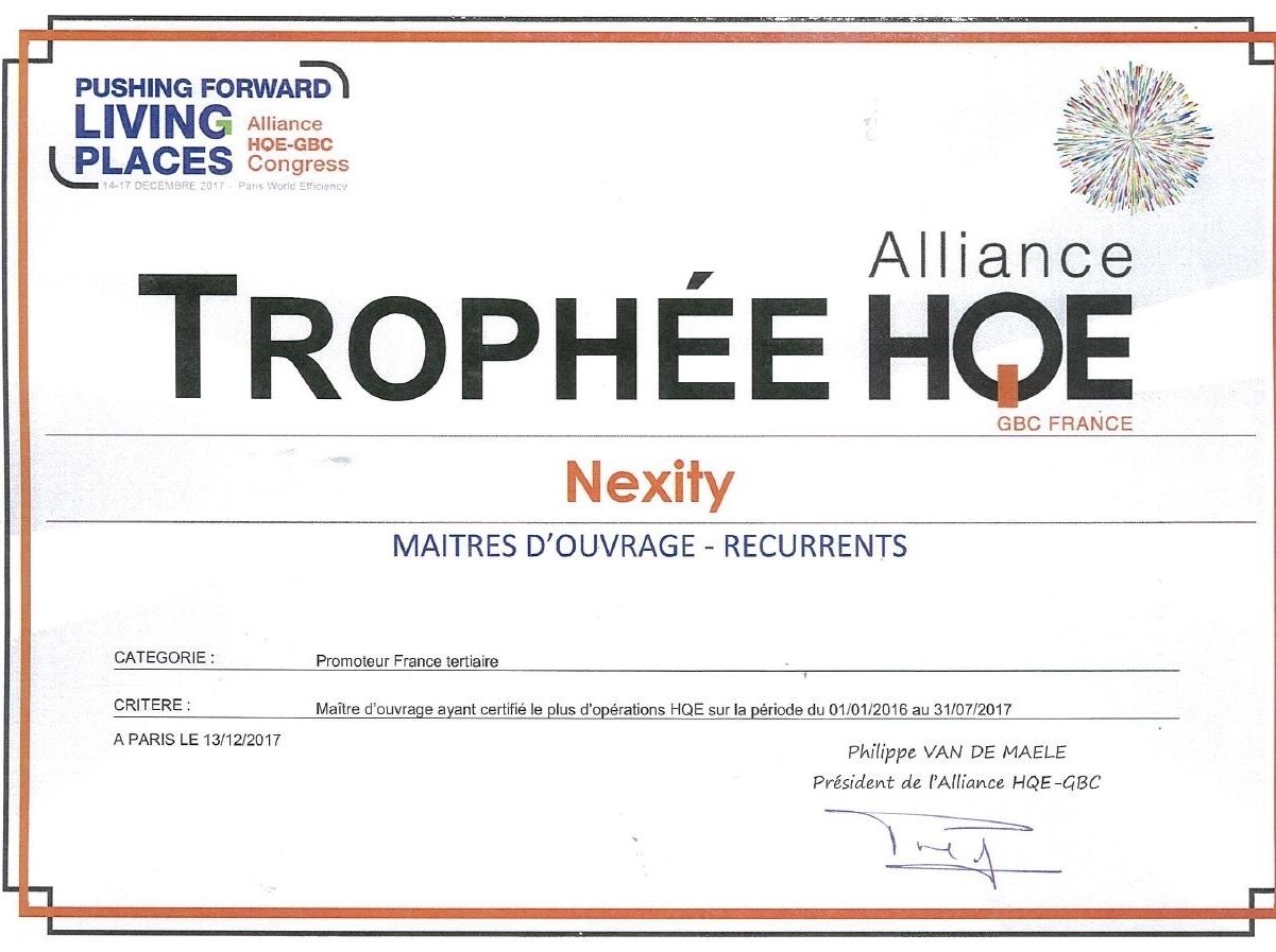 Nexity a été récompensé dans la catégorie « promoteur France tertiaire », en tant que maître d’ouvrage ayant certifié ou prescrit le plus d’opérations HQE sur la période 01/01/16 au 31/07/17.