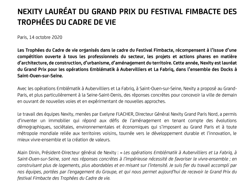 Alain Dinin, Président-Directeur général de Nexity : « Les opérations Emblématik à Aubervilliers et La Fabriq, à Saint-Ouen-sur-Seine, sont nos réponses concrètes à l’impérieuse nécessité de favoriser le vivre-ensemble ; en construisant plus de logements, plus abordables et en misant sur l’intensité. Je suis fier du travail accompli par nos équipes, portées par l’engagement du Groupe, et qui nous permet aujourd’hui de recevoir le Grand Prix du festival Fimbacte des Trophées du Cadre de vie. »